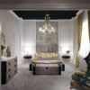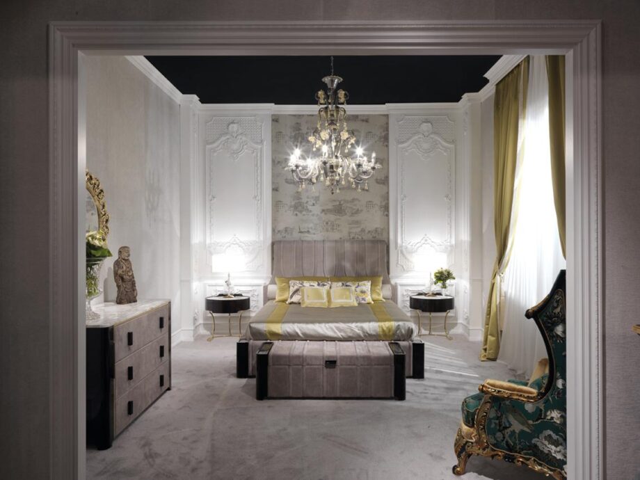 The design is further accentuated with ebony details and bright brass edgings, adding depth and character to the bed. The use of precious wood types and luxurious fabrics with classic and contemporary patterns, create a beautiful contrast that epitomizes the Bel Mondo style.