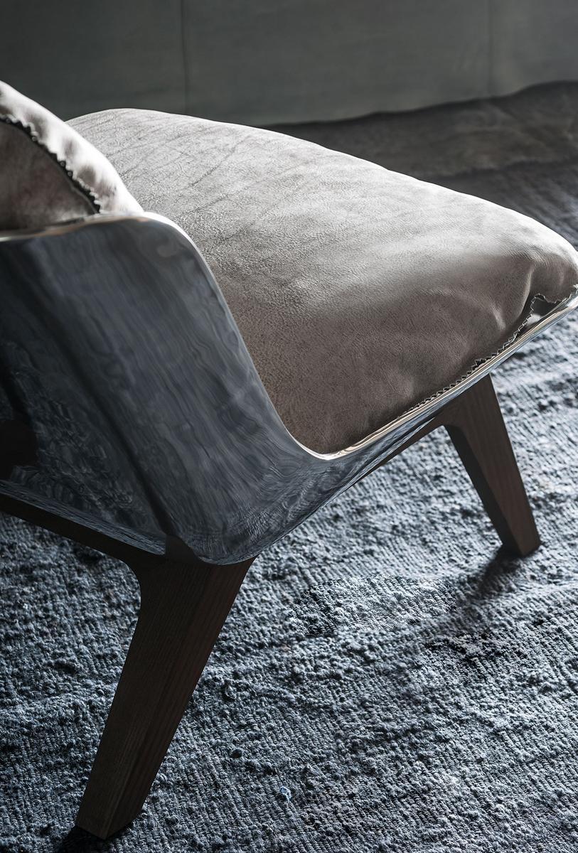 Crafted with meticulous attention to detail, the HOUSTON armchair features a base in brushed walnut-stained ash and a body in polished cast aluminum, giving it a sophisticated and elegant look. The washed and sterilized goose feather cushions are filled with differentiated density polyurethane foam, ensuring a luxurious seating experience every time.