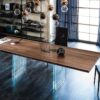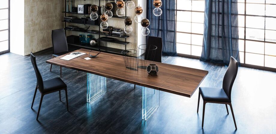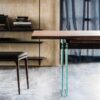 Crafted with premium veneer and tempered glass, the Ikon Drive table exudes sophistication and durability. Its transparent glass base, 15mm thick, provides exceptional stability, while the unique countertop with an uneven edge is available in Canaletto walnut veneer, Bruciato oak, or natural oak finishes.