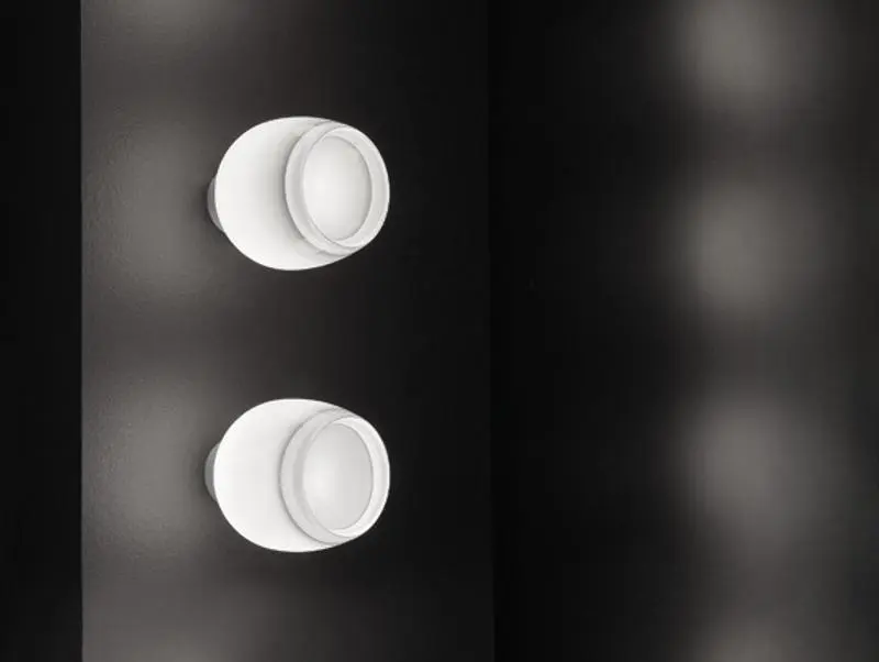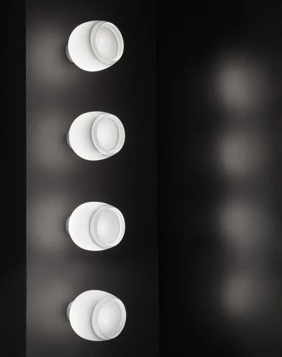 The Implode Fa 16 features a sleek spotlight shade in a mesmerizing white crystal finish, perfectly complemented by a pristine white frame. The unique design of this wall lamp creates a captivating illusion of a surface formed by the implosion of a volume, lending an air of artistic elegance to any space.