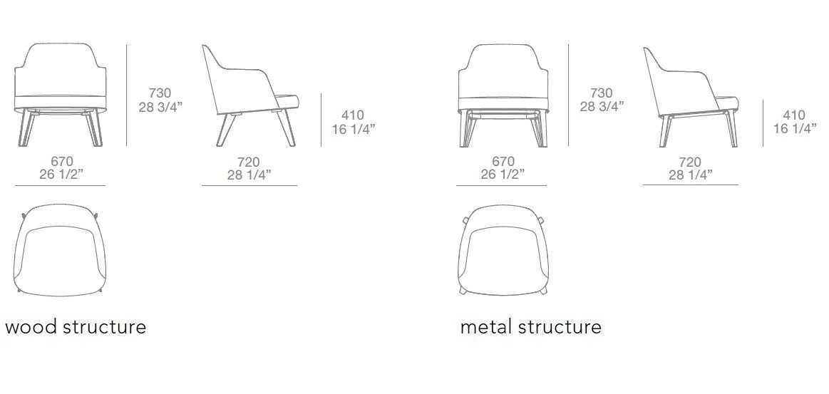 The Jane armchair is available in a range of finishes, including a solid wood base in spessart oak or dark elm, or a metal base with feet in matte and polished painted aluminum. The upholstered seat is made with flexible polyurethane foam in various densities for optimal comfort. The removable covering comes in a variety of fabric options or non-removable leather for a sophisticated touch.