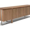 The base and details of the Kendo sideboard are made from laser-cut, folded sheet metal that has been polished and painted in a variety of finishes, while the compartments and top are constructed from solid walnut or oak with panels in MDF veneer. The open-out doors and milled handles add a touch of modernity to the design, while the interior shelves in ultra-clear tempered glass provide a sleek and practical storage solution.