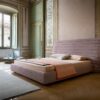 The Kenobi bed is draped in fine fabric upholstery, lending it a soft and inviting look. The fabric is skillfully tailored with sartorial stitching, producing a rhythmic vertical chiaroscuro effect. This meticulous attention to detail adds a unique touch of sophistication to the bed, enhancing its overall appeal.