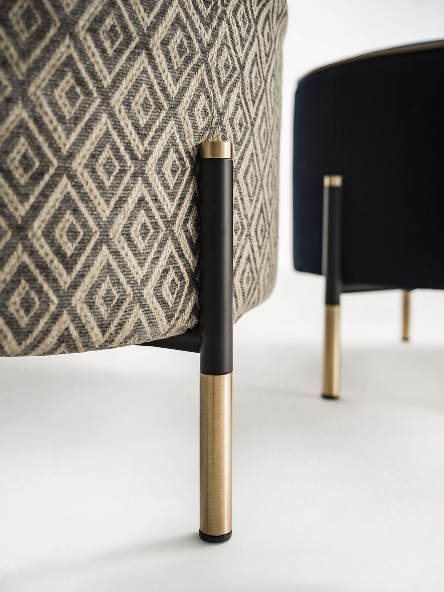 The modern design of Kevin features a sleek round shape, upholstered in luxurious fabric that adds a touch of refinement to any space. The padded seating is expertly crafted with non-deformable polyurethane, ensuring both comfort and durability. The light metal base, finished in a dark matt lacquer with satin metal accents, provides a sturdy yet chic foundation for the pouf.