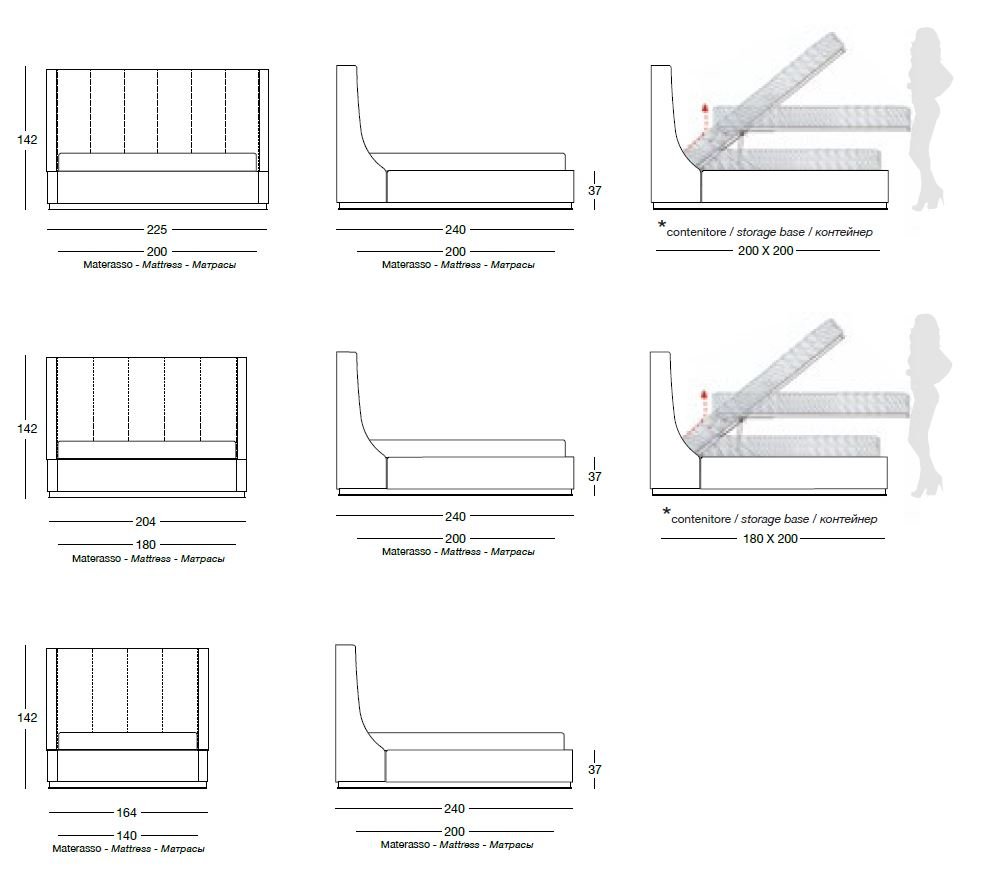 The upholstered base of the Kubrick bed is easy to mount and adjust, allowing you to customize the bed’s height to your preference. The platform base can accommodate all types of bedsprings, including fixed bedspring with wood staves and sommier spring base. For added convenience, the queen/king-sized model also includes a practical storage container.