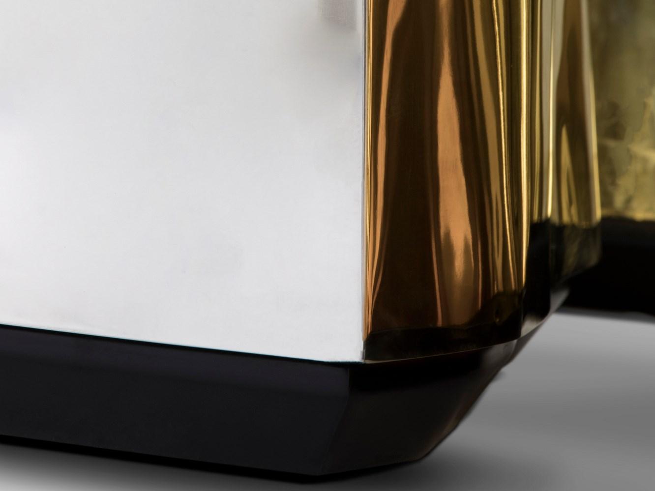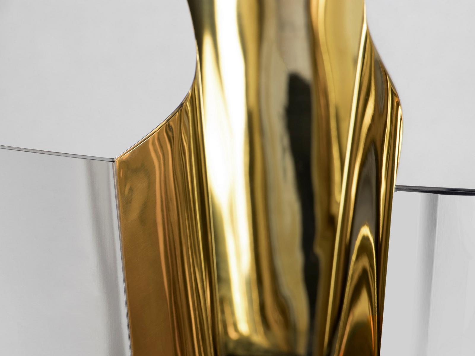 The design of the Lapiaz Oval encapsulates the moment of a stone freshly cracked, revealing a rich, golden interior. This is beautifully depicted using top quality metal materials; the polished brass details and mirrored sides emit a warm, inviting glow, making it an ideal centerpiece for your living room.