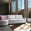 The frame of Leslie is constructed of wood and solid poplar or fir wood, ensuring robustness and longevity. The implementation of a cutting-edge bayonet coupling system ensures stability, making it a reversible modular system with a unique round end sofa finish.