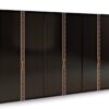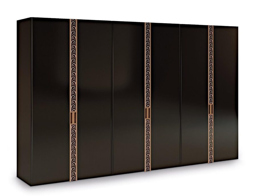 The wardrobe is a striking blend of modern design and timeless elegance. It boasts a glossy black lacquer finish, tastefully contrasted with vibrant inlaid wood. The intricate polychrome inlays add a dash of color, making this piece a true work of art.