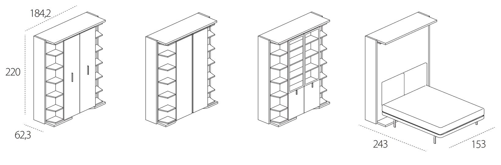 The Lgm bed is a double-function transforming system that seamlessly transitions from day to night. During the day, it boasts open-faced sections and storage compartments, offering a chic and practical storage solution for your bedroom. With a simple rotational movement, the bed transforms into a comfortable double bed with a slatted bed base, providing a cozy spot for a peaceful night’s sleep. The bed also features extractable side tables on both sides, adding a touch of convenience to your bedroom setup.