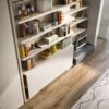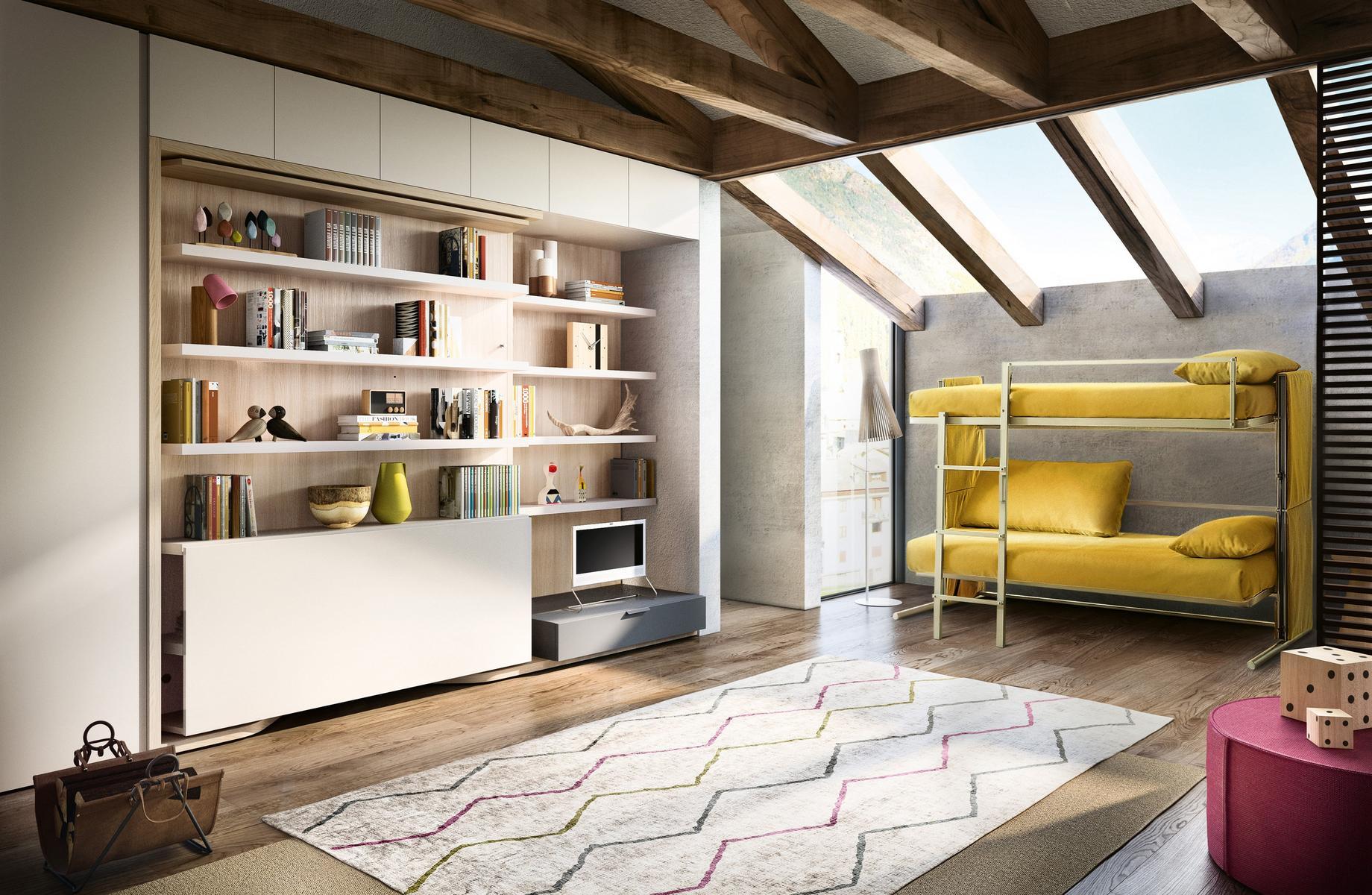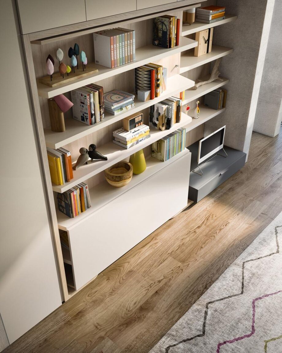 The striking LGM01/TAV double bed from the Lgm collection by designer Pierluigi Colombo is a masterpiece of modern interior design. This transforming system effortlessly combines functionality and elegance, making it a perfect addition to any stylish home. During the day, the LGM01/TAV features open-faced sections and storage compartments, along with a convenient flip-up table that tucks neatly away when not in use. As night falls, a simple rotational movement reveals a comfortable double bed with a slatted bed base and extractable side tables on both sides.