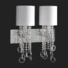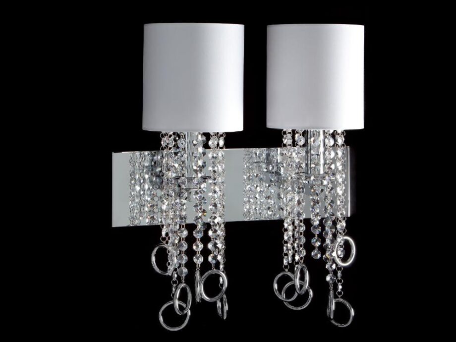 The structure of the Lisa wall lamp features cylindrical lampshades in stiff fabric that beautifully diffuse the soft LED light, creating a captivating play of shadows and light. The luxurious hanging decorations come in the form of cascading chains of crystals that add a touch of opulence to the design, enhanced by the brass rings that complete the ensemble.