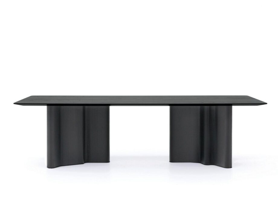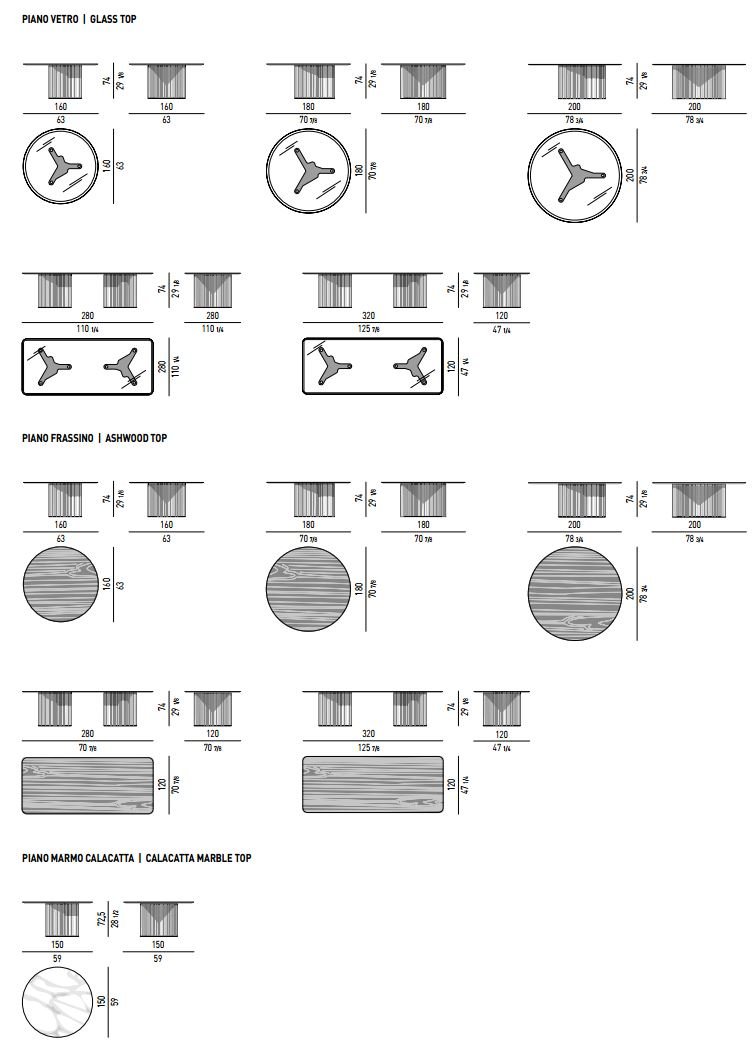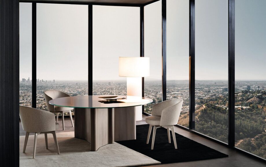 The base of the table, in prefinished Dove Grey and Licorice lacquer, adds a touch of elegance to the piece. The table top, available in open-pore stained ash in Dove Grey or Licorice color, is a testament to the designer’s attention to detail. The underside of the table carries a matt finish, matching the color of the top, in Smoked Glass laminated to extra-clear or Amber color glass. For those looking for a touch of luxury, the 150 cm diameter top is available in Calacatta marble.