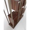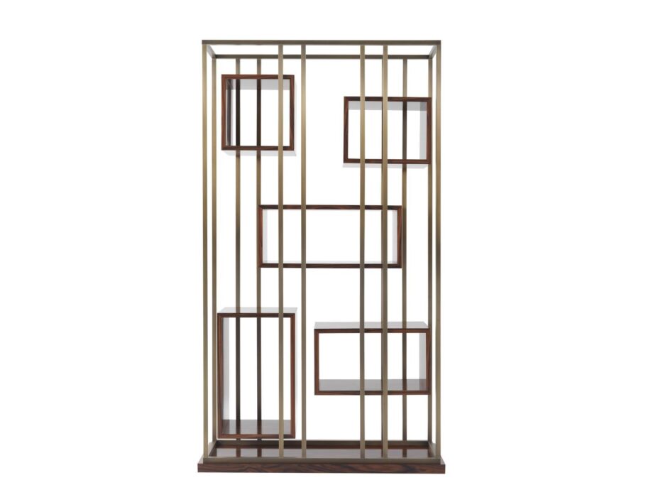 The unique construction of this bookcase showcases an intricate arrangement of mathematical blocks connected by sleek brass bars, creating a stunning visual display that is sure to captivate all who lay eyes on it. The bronzed brass finishing adds a touch of warmth and richness to the overall look, while the wood components veneered in rosewood exude a sense of timeless elegance.