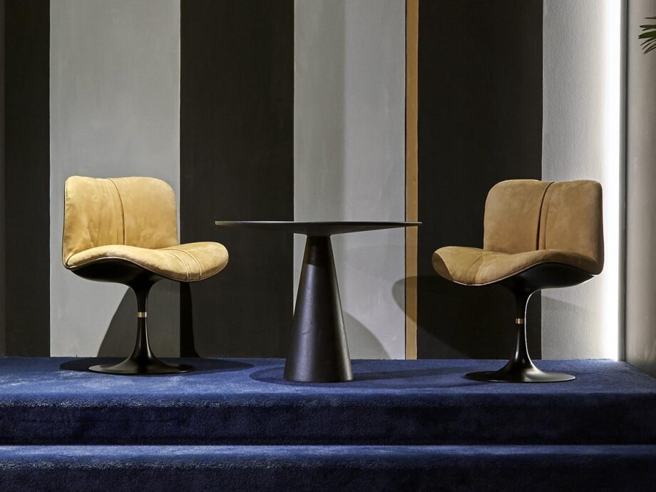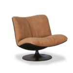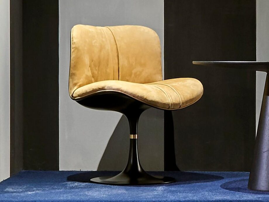 Elevate your interior design with the exquisite Marilyn chair from the renowned Draga & Aurel collection. This modern masterpiece is crafted with luxurious Nabuk leather, exuding sophistication and elegance in every detail. The sleek matte black-varnished rigid frame seamlessly complements the matte black-vanished metal revolving base with a satin-finished brass insert, creating a stunning visual contrast.