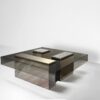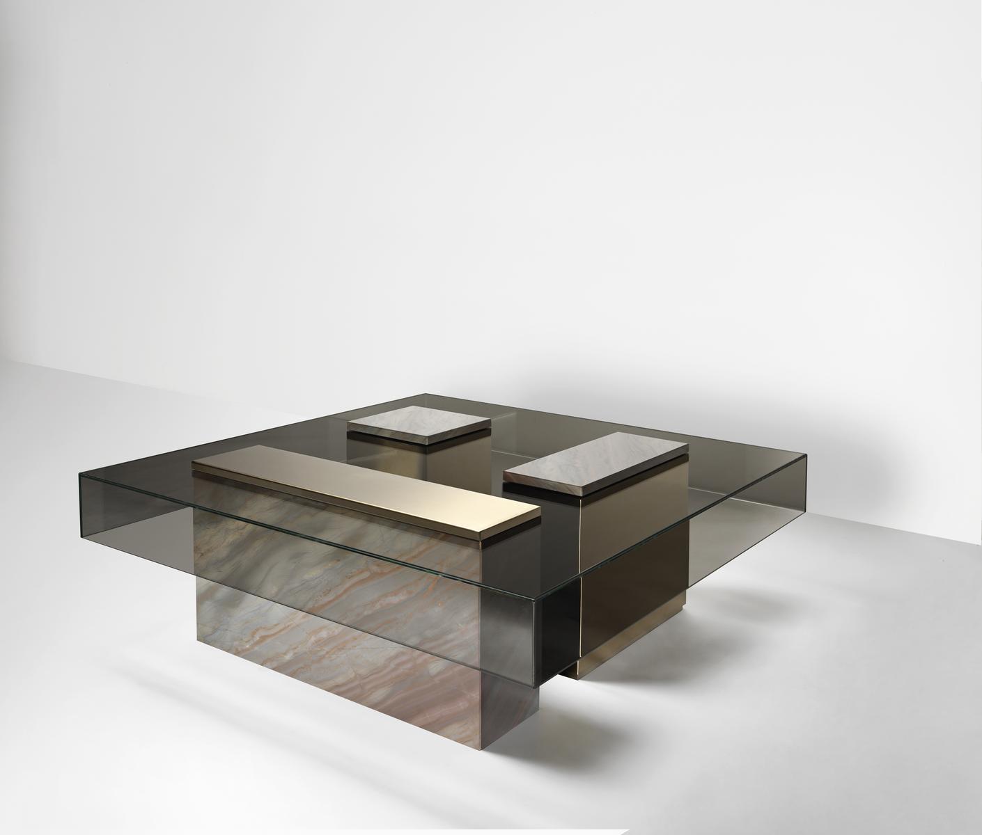 The Marty coffee table features a low square design that adds a touch of elegance to any living space. The glass tops are transformed into architectural volumes, while the bases are intricate compositions made with a mix of stones and metals. The result is a functional work of art that serves as the centerpiece of your home.