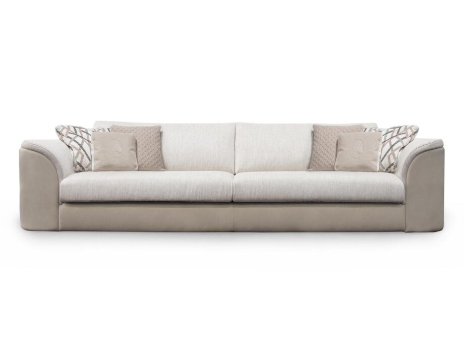 The Master sofa comes with a selection of stylish pillows, including a leather Nabuk Tuber with a printed horse logo and fabric Brera design. The cashmere pillow with plan braids in a Dune color adds an extra touch of luxury to the ensemble.