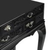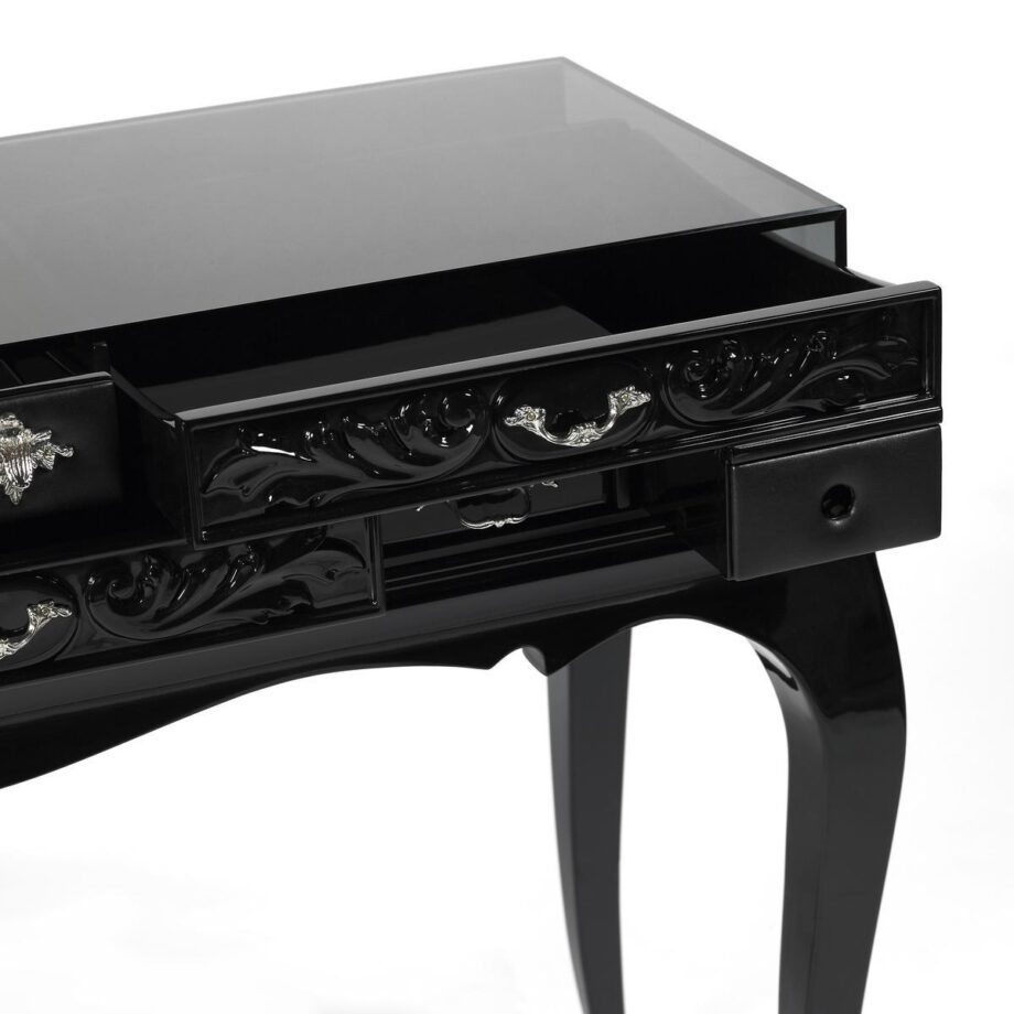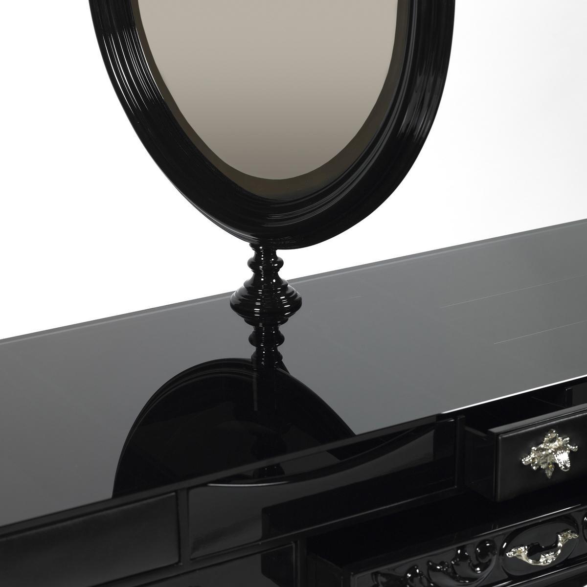 Crafted with precision, the Melrose dressing table is made from high-quality mahogany wood lacquered in black, finished with a high gloss varnish. The grey glass, silver-plated brass, and grey mirror in bevelling add a layer of luxury to the piece. The drawers, finished in high gloss black lacquer and leather, further enhance its aesthetic appeal.
