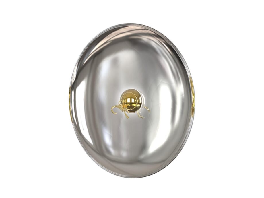 Crafted with meticulous attention to detail, the Metamorphosis mirror features a large, round, polished stainless steel structure that is nickel bathed, creating an enchanting concave shape. The mirror’s radiant glow emanates from a sophisticated lighting system embedded within. Its standout feature, a sleek gold scorpion, is cast from fine brass and perched in the center, nestled within a semi-sphere of polished stainless steel. This intriguing motif pays homage to the darker side of nature, where challenges are endless yet compelling.