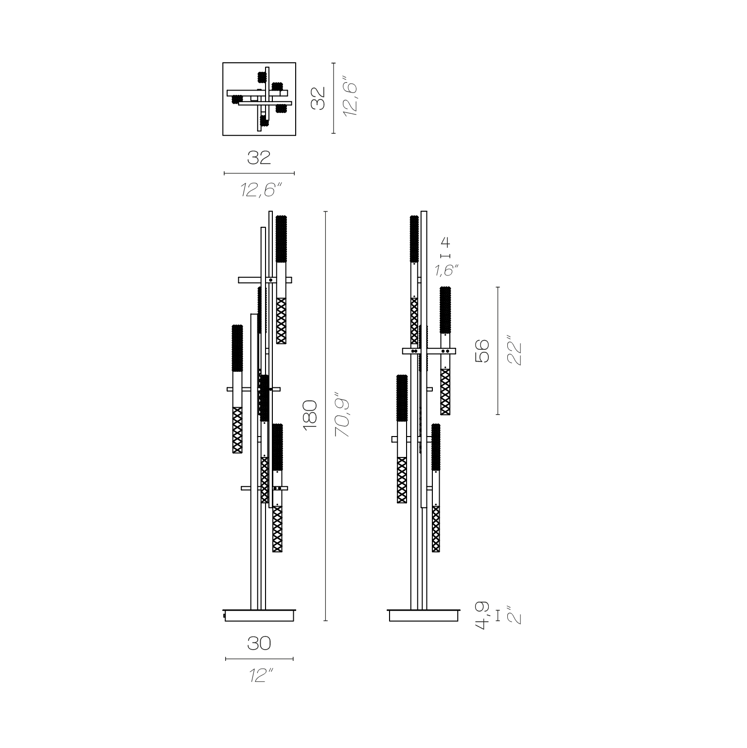 The Mikado floor lamp features a stunning combination of rectangular brass tubes and engraved crystal parallelepipeds, creating a harmonious and balanced design. The LED light source, with a custom 5,600 Lm output and 3,000 K color temperature, illuminates the crystal elements beautifully, enhancing their preciousness.