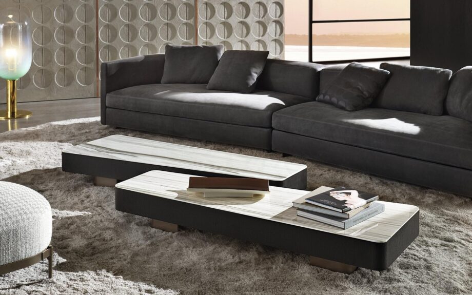Despite their generous surface area, the Milton coffee tables’ low height ensures they do not dominate the room but serve as functional yet decorative elements. Some versions come with drawers or a void space, accentuated by a satin-finished metal sheet covering the internal surface. A rotating version is also available, providing a blend of function and style that is hard to resist.