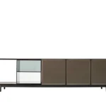 The Morrison’s base is available in three versions: resting on the floor, or elevated at heights of 12 cm and 25 cm. The new open-pore oak finish in a Tobacco stained color complements the Moka, creating a striking contrast. You can also opt for an all-oak Tobacco door version with a lacquered satin-finish Mud structure.