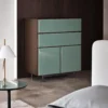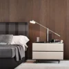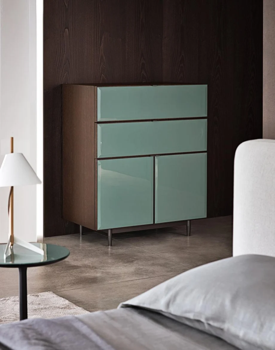 This bedside table comes with drawers that are not only spacious but also have a beveled edge running around the perimeter, defining the line of the doors and front section. The drawers are available in a glossy lacquered finish in Sand, Celadon, Mud, Granite, and Moka, or in a leather-lined version, offering you a variety of options to choose from.