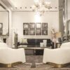 With its sleek design and glamorous gold base, the Muzio armchair is a true statement piece that will elevate your space to new heights of chic. The addition of armrests adds a touch of comfort and functionality, making it ideal for both lounging and entertaining.