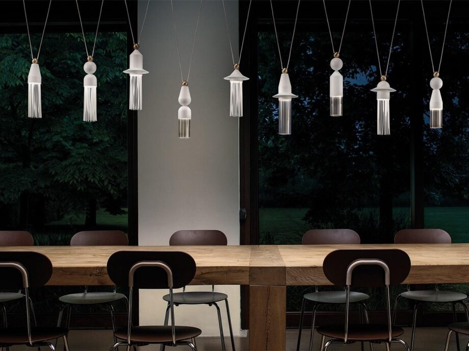 The Nappe collection showcases a range of lamps with painted metal constructions and smoked Pyrex glass accents. The unique design of the C10 pendant lamp makes it a standout piece that will impress your guests and elevate your space. Whether you hang it over a dining table, kitchen island, or in a living room, this pendant lamp is sure to make a statement.