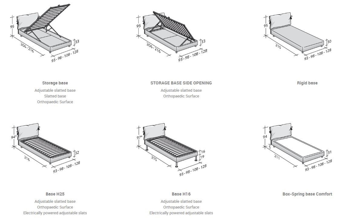 But that’s not all – the Nathalie bed is designed with storage in mind. The headboard features handy cushion covers that allow you to store pillows and keep them dust-free. Choose from different base options including a rigid base, box-spring base, storage base, fixed base (available in 25 cm or 16 cm height), or even a version with electrical movements for added convenience.