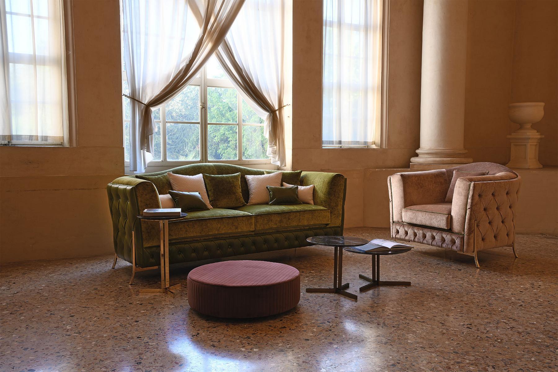 Nefele’s design is inspired by the classic outline, masterfully interpreted to suit modern aesthetics. The sofa’s personality is further enhanced by its tall, elegant legs, featuring a polished brass galvanic finish. This detail adds a touch of glamour that complements the overall design, making Nefele a standout piece in any room.