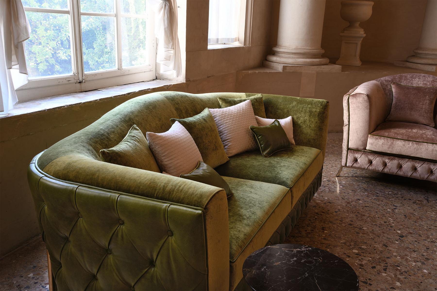 Crafted from the finest fabric and leather, Nefele presents a plush and comfortable seating experience. The softness of the material, coupled with the tufted upholstery, creates an inviting atmosphere, making guests feel at home. The upholstery options include luxurious velvet or nubuck, and are also available in a fireproof version, ensuring safety without compromising on style.