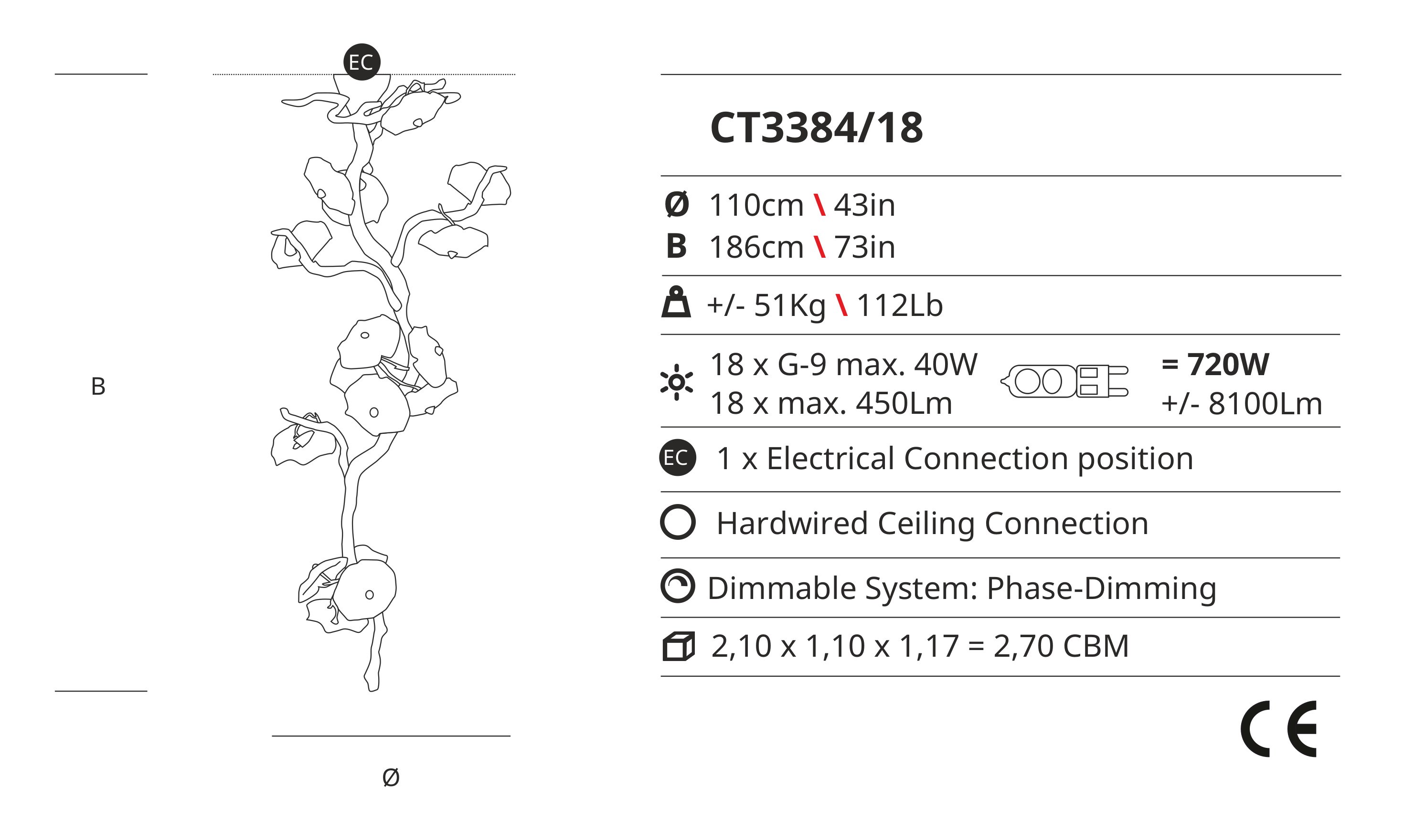 Perfect for delicate interiors and vertical architecture, the Nenufar Ct3384/18 is ideal for those who appreciate beauty and craftsmanship. With its dimmable feature, you can easily adjust the lighting to suit your mood and setting. Whether you choose halogen or LED lighting, this ceiling lamp will add a touch of luxury to any room.