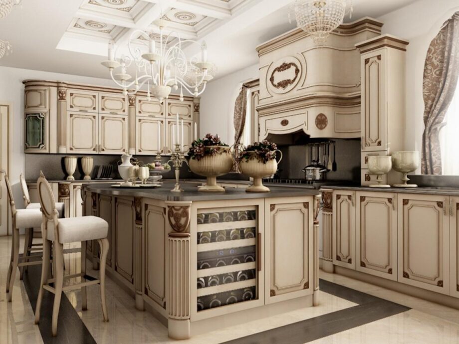 Our exceptional skills in personalized carving are prominently displayed in this unique kitchen design. The decorated profiles, columns, drawers, and doors are adorned with intricate carvings that exude an air of elegance. The wall units, too, are embellished with these delicate decorations, enhancing their aesthetic appeal.