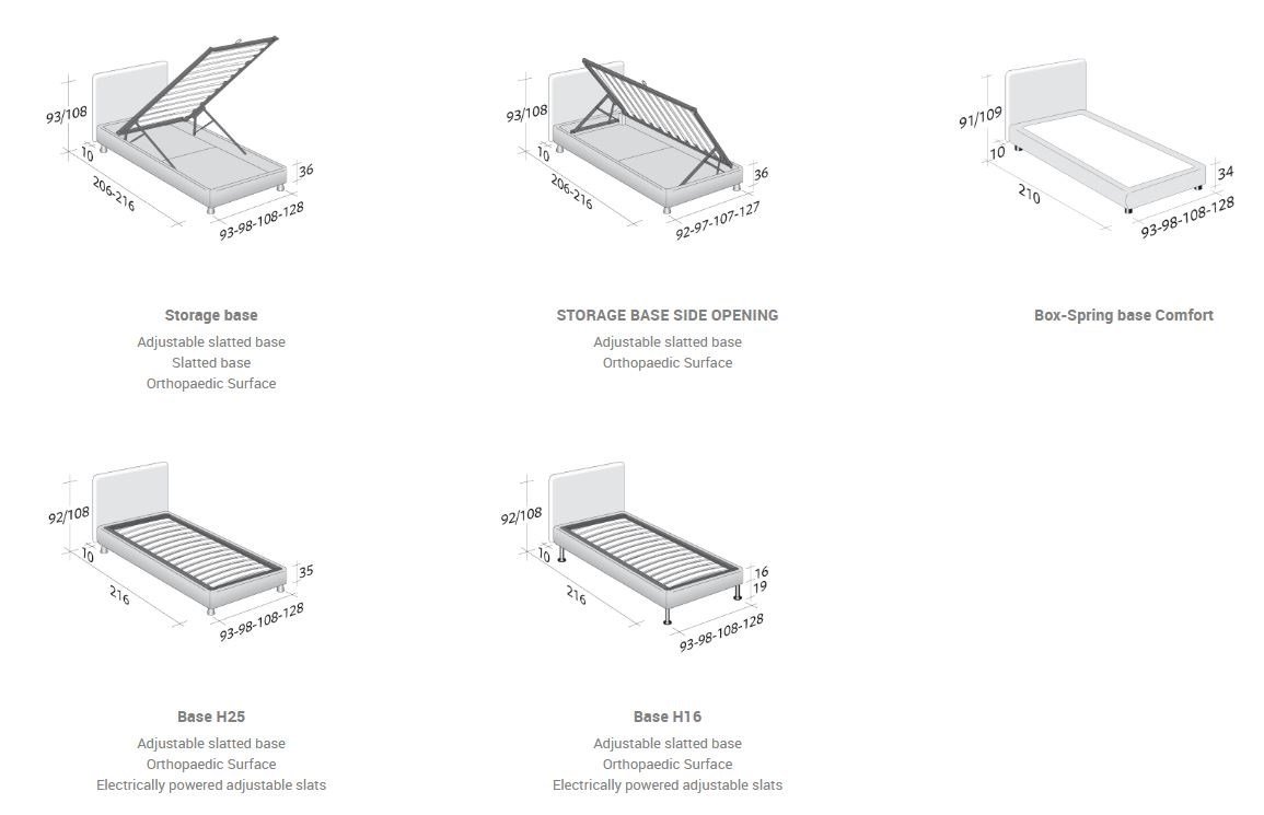 The Notturno 2 bed set is available with various base options, including the Leonardo box-spring base, storage base, fixed base in two different heights, and even with electrical movements for added convenience. The headboard is also customizable, with two height options and a choice of fabric, leather, or Ecopelle covers that are easily removable for cleaning.