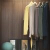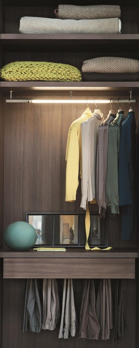 The interior of the Nur wardrobe features a wide range of customizable configurations, including cabinet units, display cases for accessories, and shelves with integrated lighting. The structure can be finished in melamine, glossy or matte lacquer, or wood, while the door frame can be metal, and the door panel can be fabric, eco-leather, or glass.
