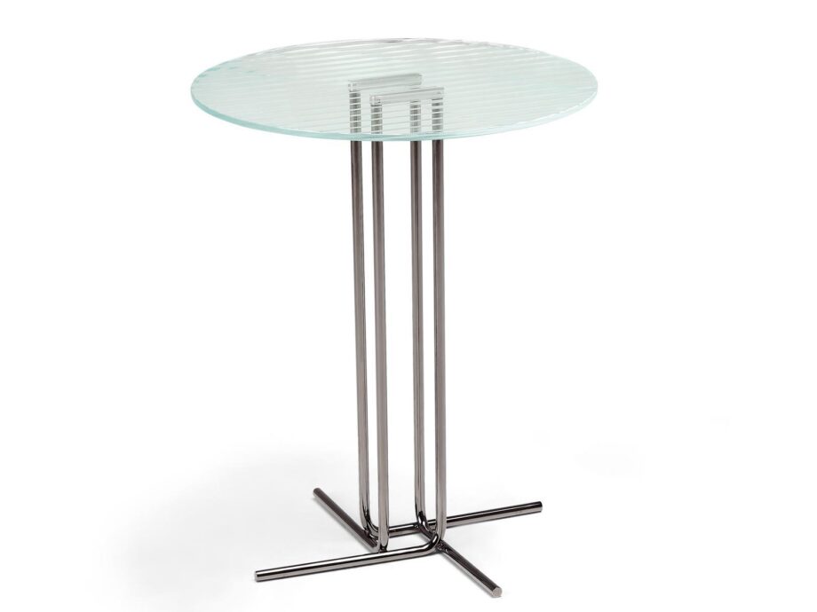 Crafted with a laser-designed and cut glass top, this table exudes precision and finesse. The contrast of geometric shapes and slender legs adds a touch of contemporary flair to any room. The metal base comes in either a sleek black nickel or a sophisticated varnished micaceous brown finish, providing a luxurious touch to your decor. The extra-light engraved transparent glass top adds a touch of refinement to the overall design.