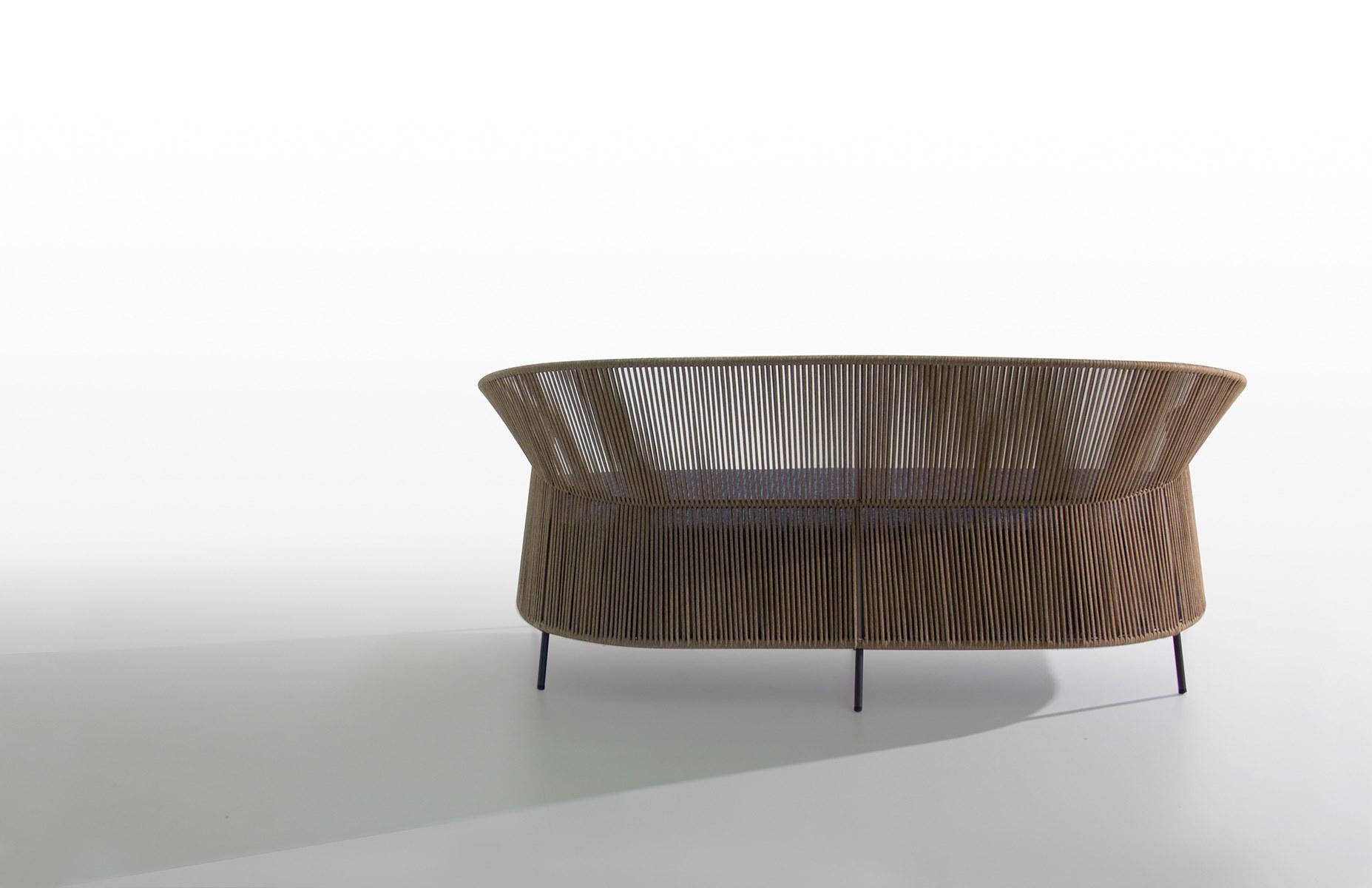 Crafted with a cylindrical metal backrest handwoven in Fly ribbon, the Ola sofa exudes elegance and sophistication. The legs are made with lacquered treated steel AISI 316 pipe, ensuring durability and stability. The seating pad is filled with fire retardant polyurethane foam and polyester padding, providing ultimate comfort and support.