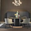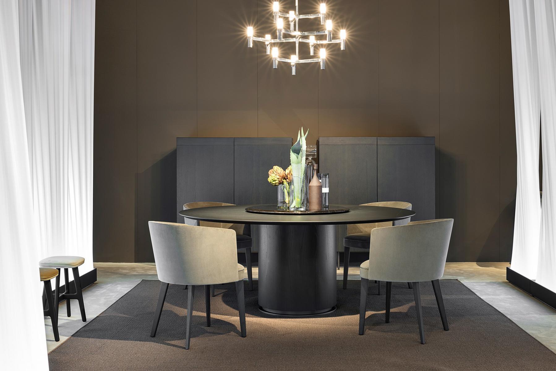 The Otab round table is a harmonious balance of proportions, with the substantial base complemented by the sleek top. The base, crafted in ash wood or Canaletto walnut, is accentuated by a unique detail in tanned metal that adds a touch of sophistication to the design.