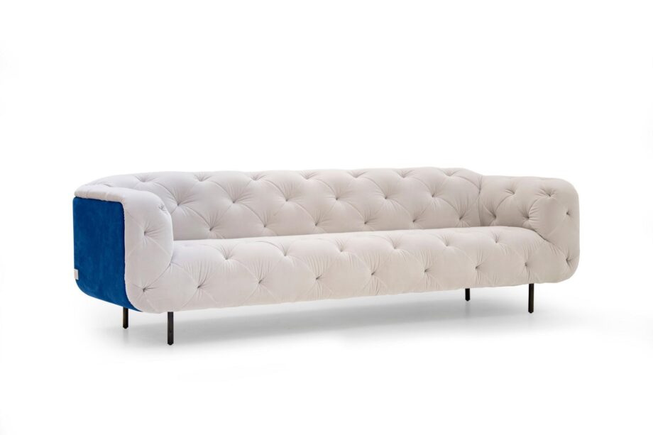 Introducing Overseas/b, a luxurious 3-seater sofa from Italy that exudes modern elegance and sophistication. Crafted with the finest materials, this stunning piece features tufted velvet upholstery in a rich Lario col. 29, complemented by a cowhide Nabuk exterior in black. The sleek metal feet in a Titanium finish add a touch of glamour to this contemporary design.