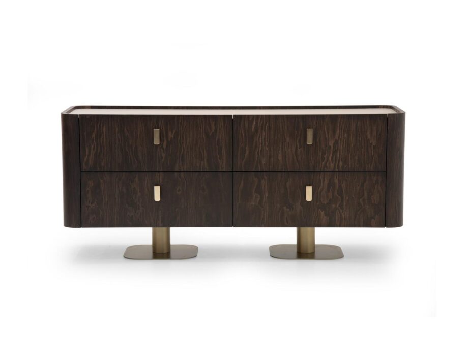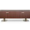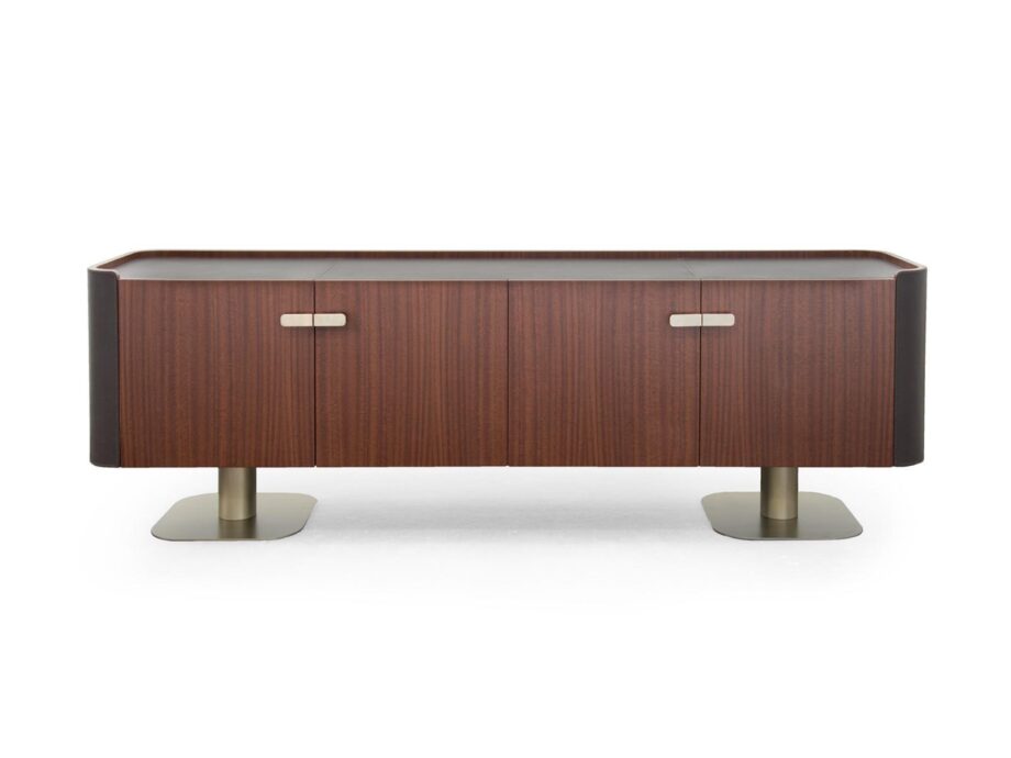 The Overseas Sideboard boasts a sleek structure and top in calfskin Daino in a rich chestnut hue, exuding elegance and charm. The front doors feature a striking veneer Mahogany matt finish, complemented by metal handles in a light gold matt color for a touch of opulence. The metal legs in Goldchamp S. matt add a contemporary flair to the overall design, making it a statement piece in any room.