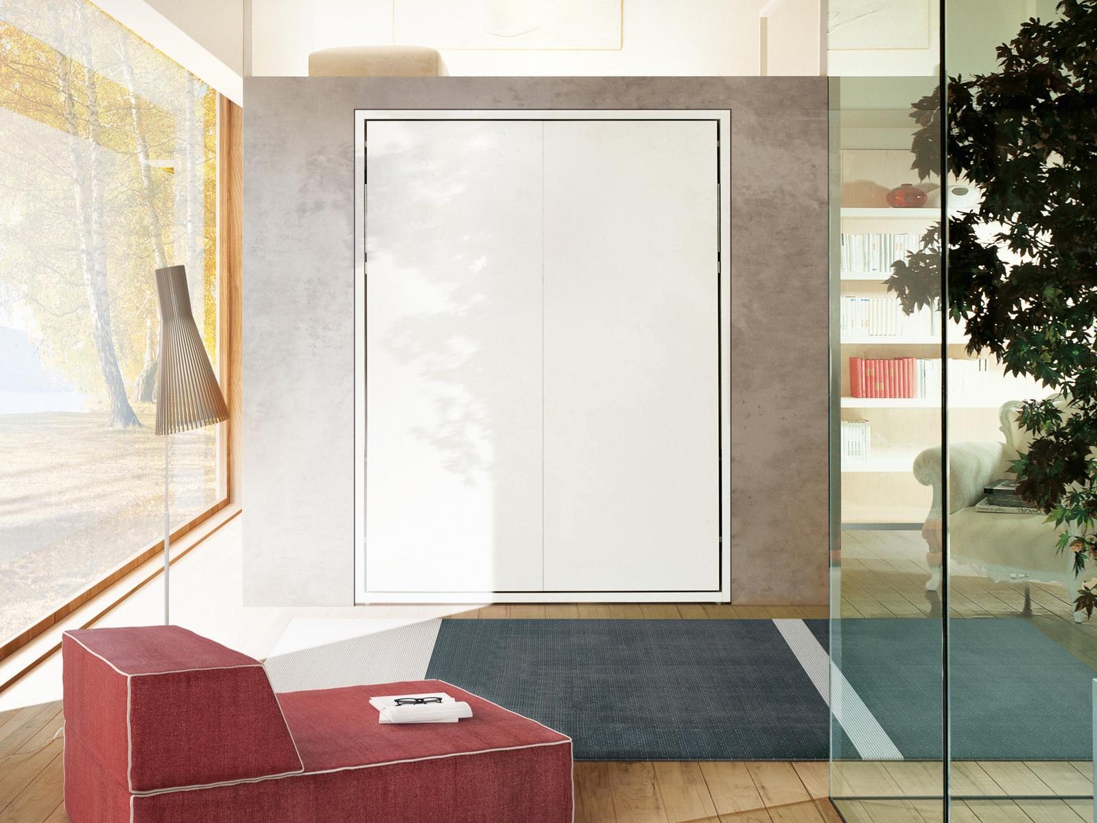 The Penelope 2 Standard features a vertical double bed with a patented bed base and mattress, offering a comfortable and luxurious sleeping experience. The bed has a tilting opening mechanism that allows for easy access and storage. Choose from two versions: the P.35 cm version with a fabric headboard or the P.62,3 cm version with shelves and a storage compartment behind the headboard.