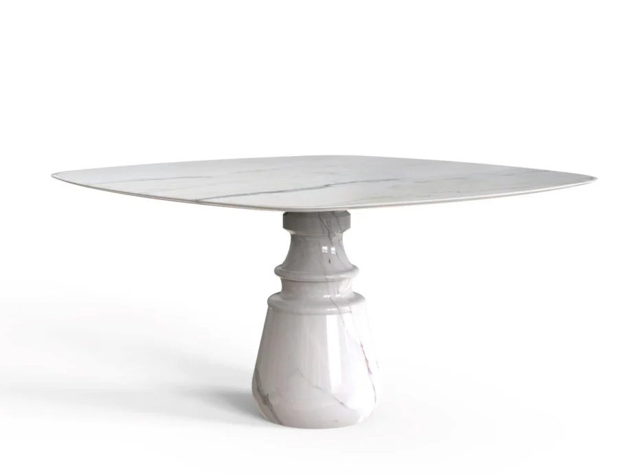 At the heart of the Pietra Square’s design is a robust marble column, hand-sculpted and turned to create a variety of textures. This detailed pedestal base is carved from a solid block of marble, a noble material that gives the table its luxurious feel and appearance.