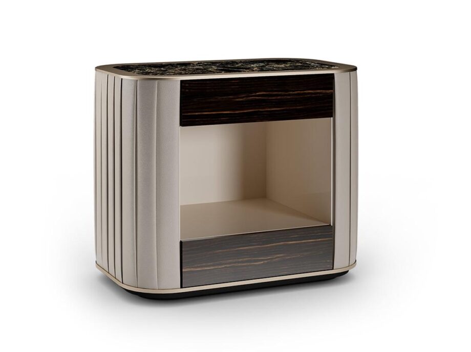 Crafted from high-quality wood, the Plissè bedside table features a striking rectangular shape with two spacious drawers, providing ample storage space for your essentials. The elegant design is further enhanced by the luxurious details, including the top in a silk finish metal and sides upholstered in sumptuous creased leather or fabric.
