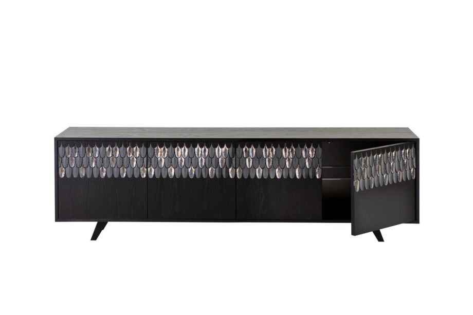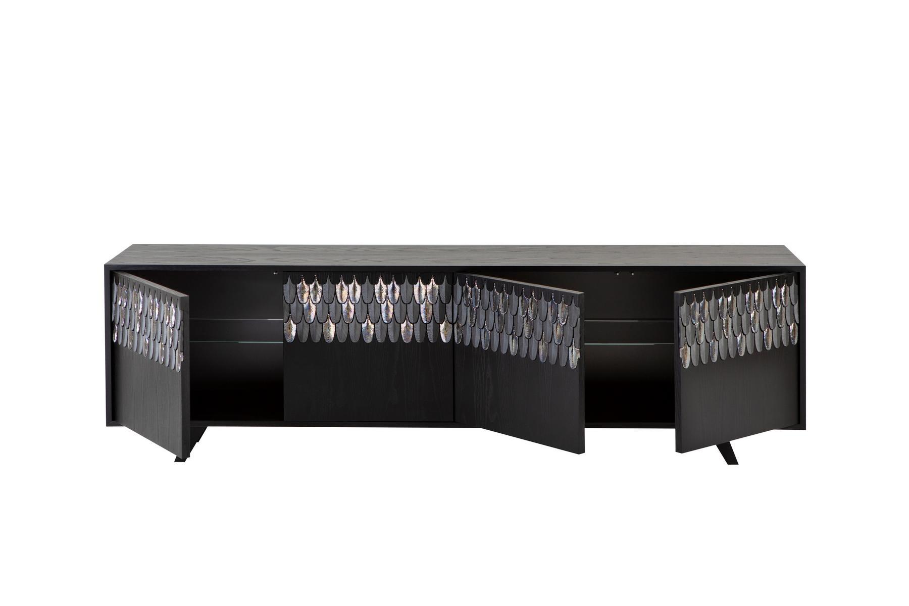 The Plumage collection, with its unique ceramic mosaics, adds a touch of sophistication to any space, making this sideboard a standout piece in any interior design scheme. The combination of ceramic and wood materials creates a harmonious blend of textures, while the sleek design and clean lines give the piece a contemporary edge.