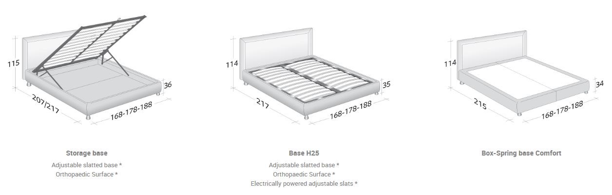 The Pochette Pure bed is available with a choice of base options, including the Leonardo fixed base at 25 cm height, a storage base, or a base with a movable frame. The headboard and base are both upholstered in fabric, leather, or eco-leather, all of which are completely removable thanks to the convenient Velcro closures.