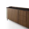 The Postmoderne sideboard features a sleek design with doors and drawers for convenient storage. The 8 mm multi-employ clad in pecan veneer adds a touch of luxury, while the rounded carcase in argile or plomb lacquer gives it a contemporary edge. The doors and drawers are beautifully finished in stained pecan facade with interior accents in argile or plomb lacquer.