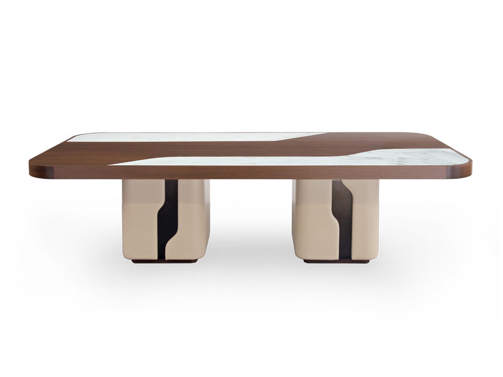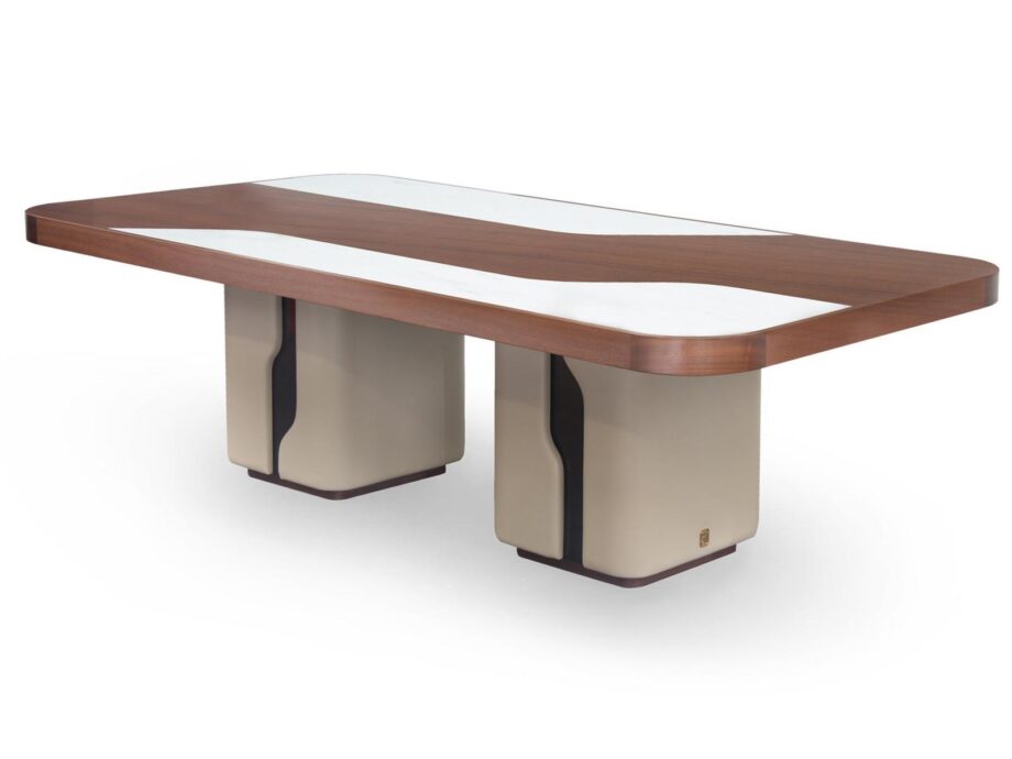 The wooden edge and focal supplement of the top, along with the side supplements in marble Afyon white, create a stunning contrast that will impress your guests and elevate your dining experience. The legs in leather Daino col. Fudge and metal col. titanium lustrous, along with the base in veneer Mahogany matt finish, provide a sturdy and durable foundation for this exquisite piece.