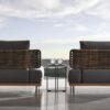 One of the defining features of the Quadrado is its unique square suspended platforms, inspired by the teak duckboard used in yachting. This innovative design allows for easy water outflow, making the Quadrado a practical choice for outdoor use. The seating elements are complemented by comfortable padded cushions, upholstered in a special woven fabric with a wicker effect, available in Mud or Licorice colour.