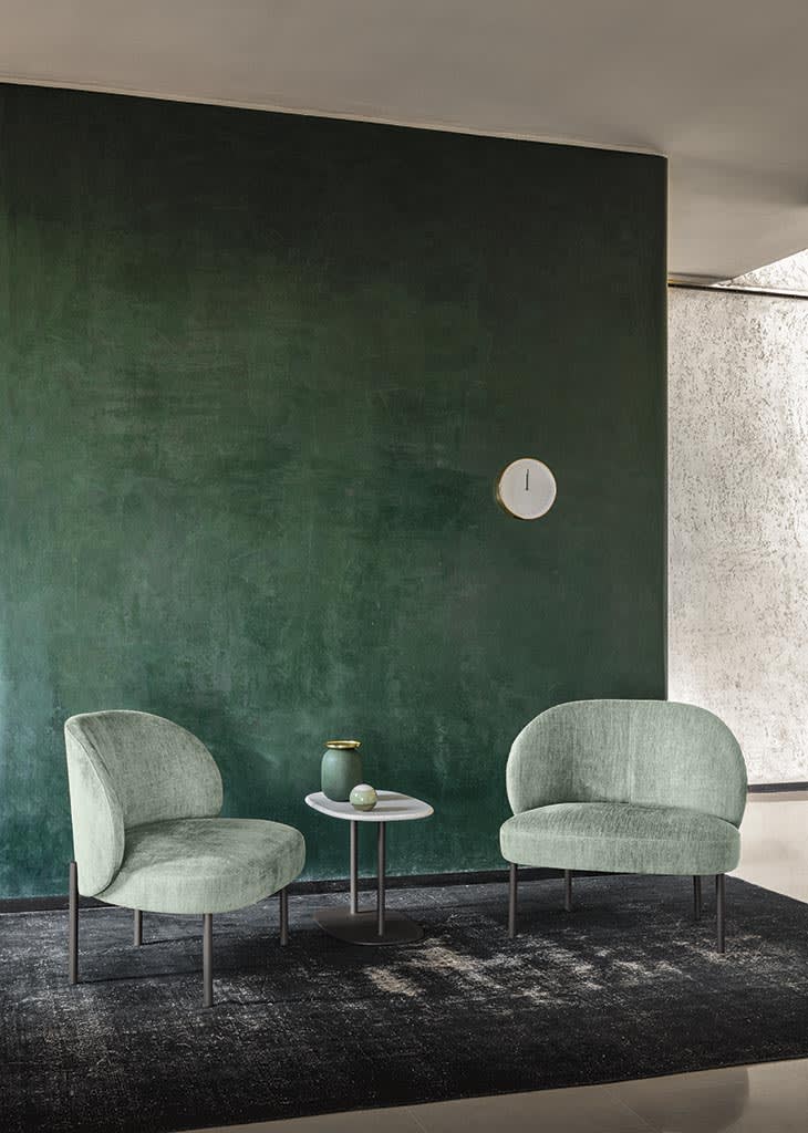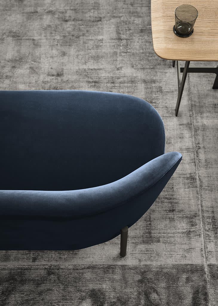 A standout feature of the Raku collection is the distinctive design of its feet, which appear to lean effortlessly against the outer edge of the backrest, creating an impression of lightness and grace. The bench, in particular, showcases an ingenious wooden armrest. This element not only subtly divides the seating area but also provides a functional surface for resting items, highlighting the thoughtful engineering behind every detail.