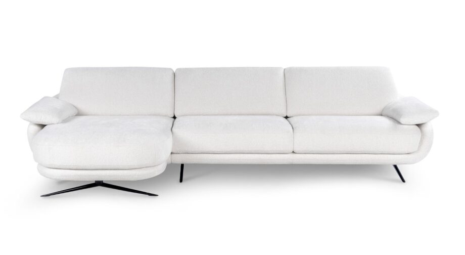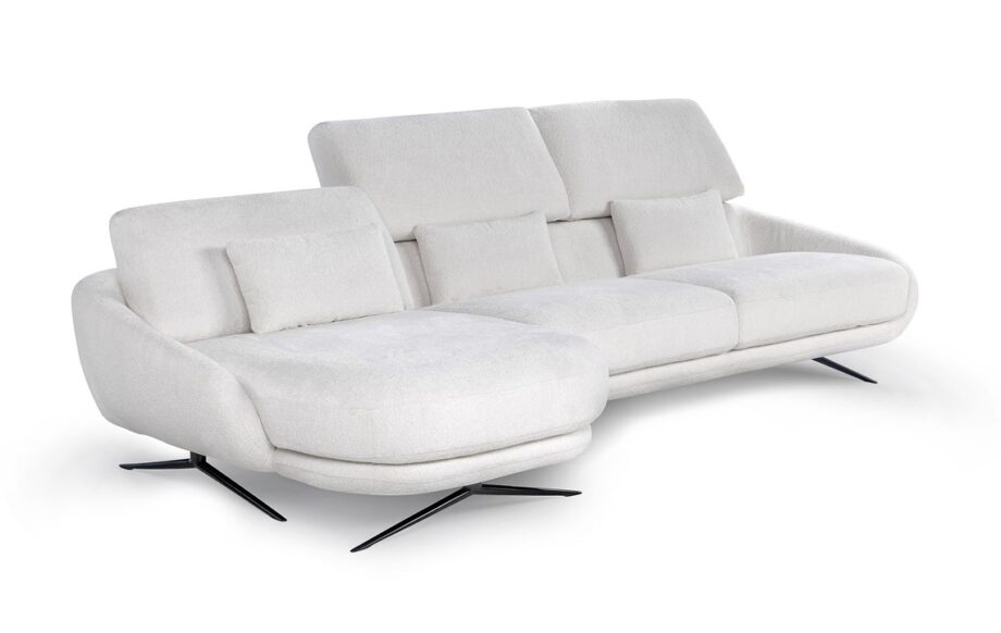 The design is accentuated with a durable metal base and slender metal feet, available in various finishes. The sofa’s commanding presence is further emphasized by its raised backrests that lend it an authoritative ‘Regal’ look. Additionally, it comes with a chaise longue, footstool, headrest, and a high back for added comfort.